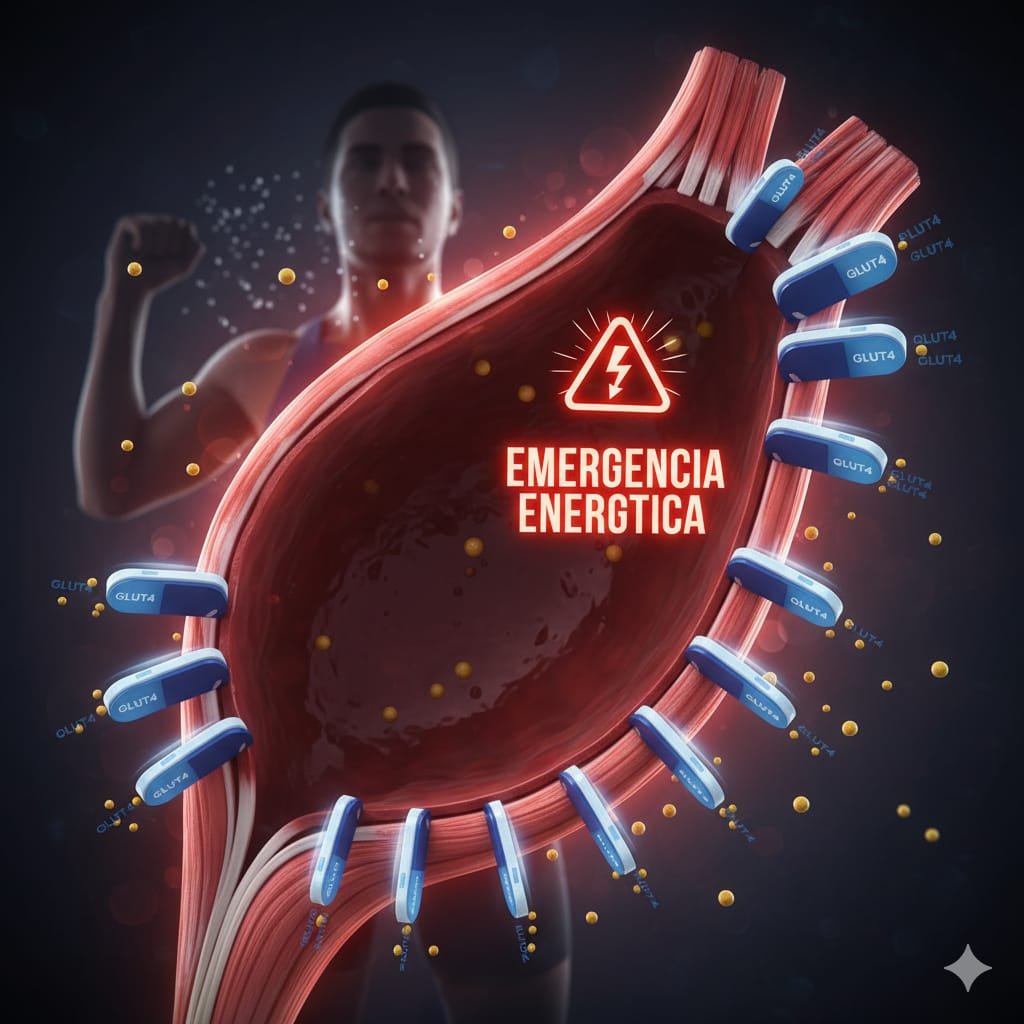 Cuando haces ejercicio de fuerza, tus músculos agotan sus reservas de glucógeno (esa «gasolina» muscular). Tu cuerpo lo interpreta como una «emergencia energética» y, como respuesta, multiplica los receptores GLUT4 en la superficie de tus células musculares. Esto hace que, después de entrenar, tus músculos estén mucho más receptivos a la glucosa en sangre.