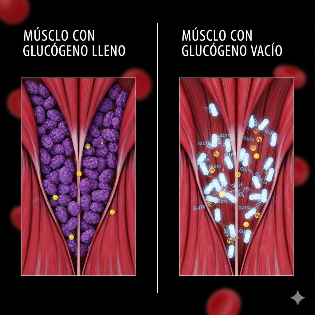 El Riesgo de «Sobrecarga»: Si el músculo está siempre lleno de glucógeno (por inactividad o consumo constante de HC), esa señal de «emergencia» no se activa. El cuerpo ya no necesita meter glucosa con tanta prisa, los niveles de GLUT4 bajan, y se vuelve a caer en la resistencia a la insulina.